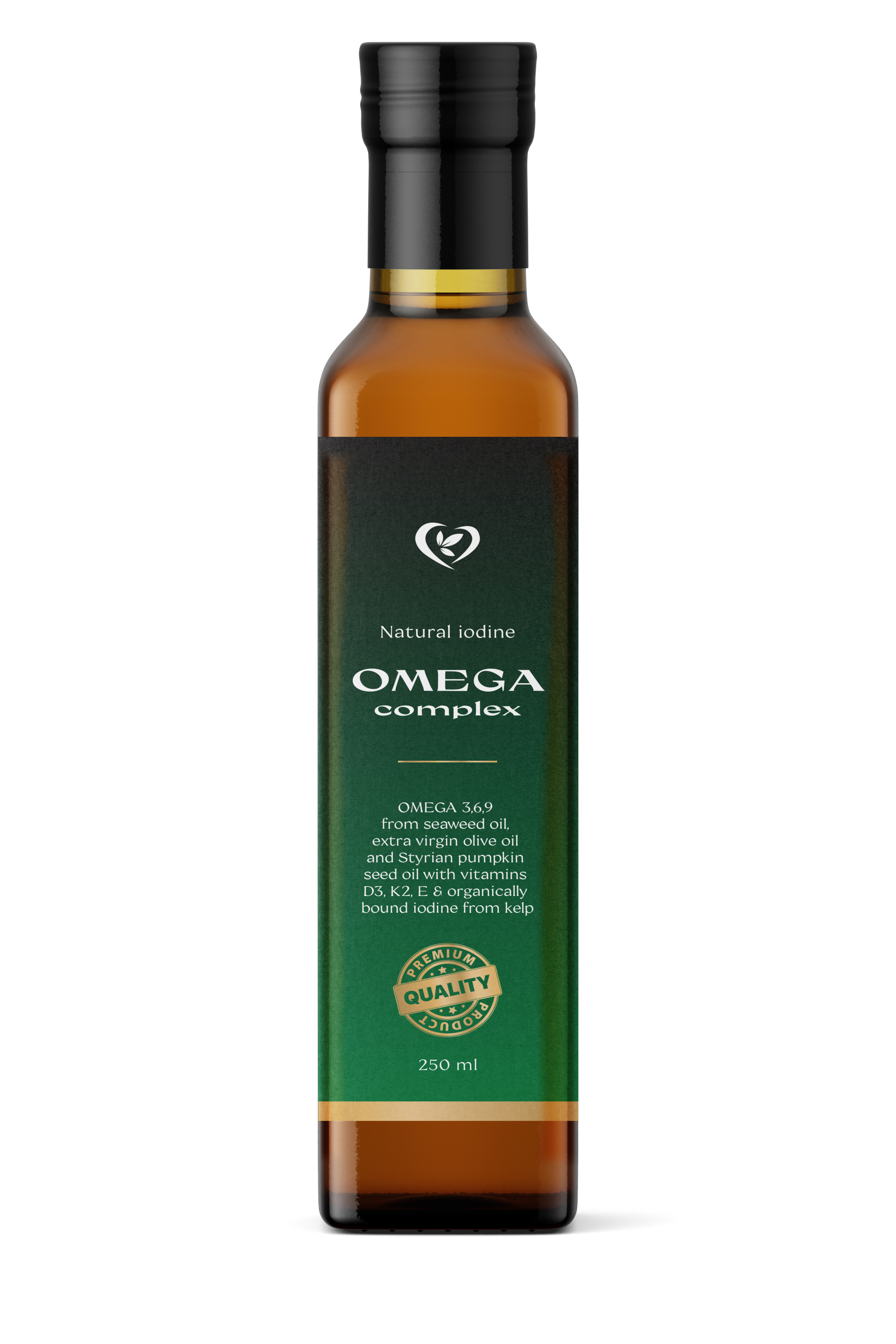 Organicky vázaný jód z mořských řas, který jsme přidali do 3 rostlinných olejů, a to do oleje z mořských řas s výjimečným obsahem EPA a DHA, panenskému olivovému oleji a dýňovému oleji, které jsou společně nositeli nenasycených mastných kyselin Omega 3,6,9 – ve správném poměru omega 3 k omega 6 a 9, a obohatili jsme je o vitamíny D3, K2 a E. Spolu s liposomálním komplexem ALFA, který obsahuje liposomálně zpracovaný Se + Zn + L-tryptofan, vytvářejí tyto dva doplňky stravy požadovaný synergický účinek.