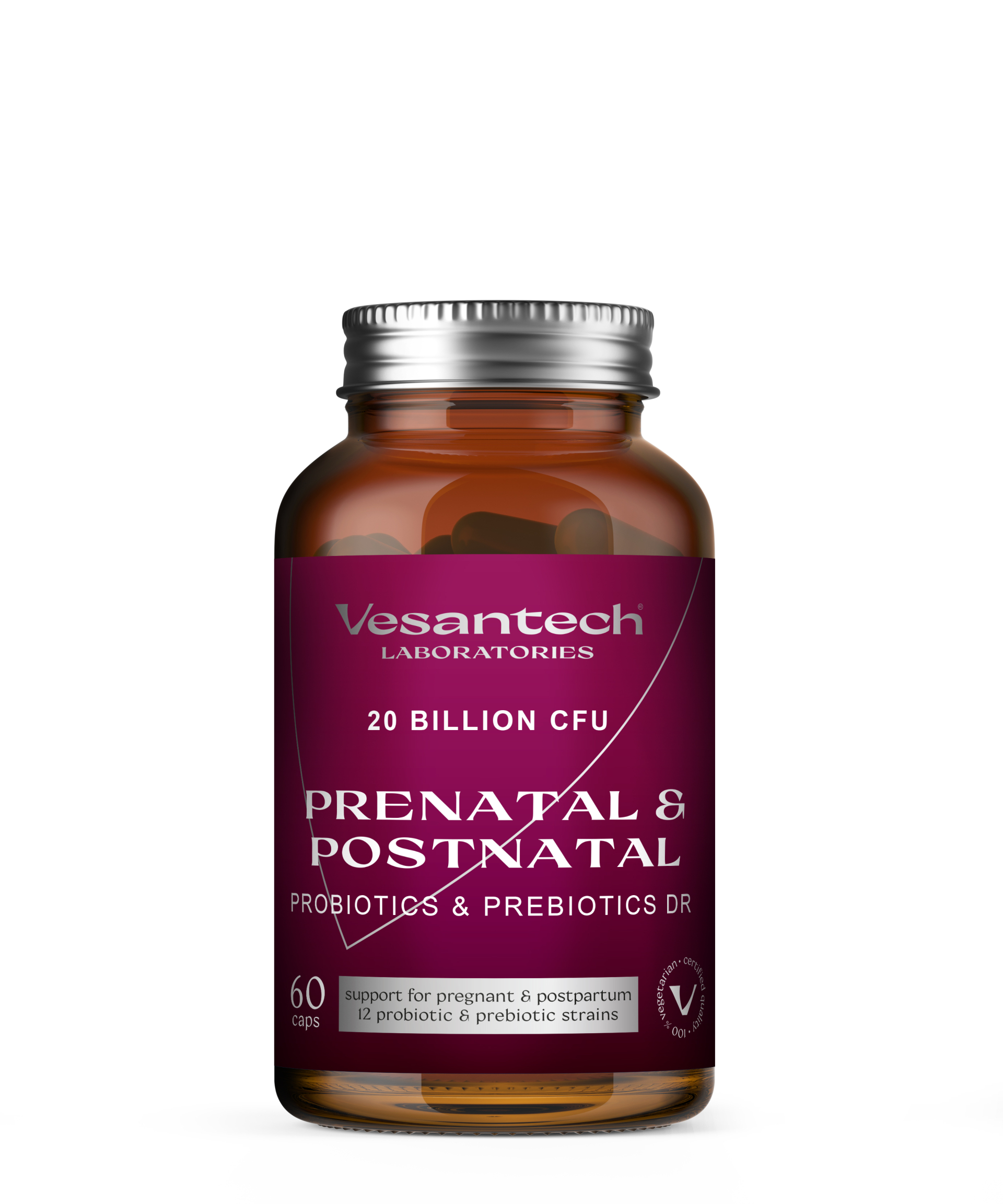 Vesantech Prenatal & Postnatal Probiotics DR je prémiový probiotický komplex vyvinutý speciálně pro potřeby žen během těhotenství, po porodu a během kojení. Bezpečný pro plod, kojence i matku.